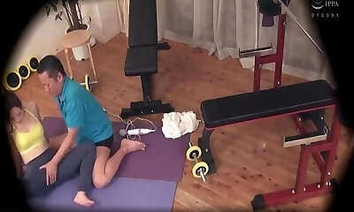 淘气的亚洲青少年得到frigged然后romped通过她的教练在健身房
